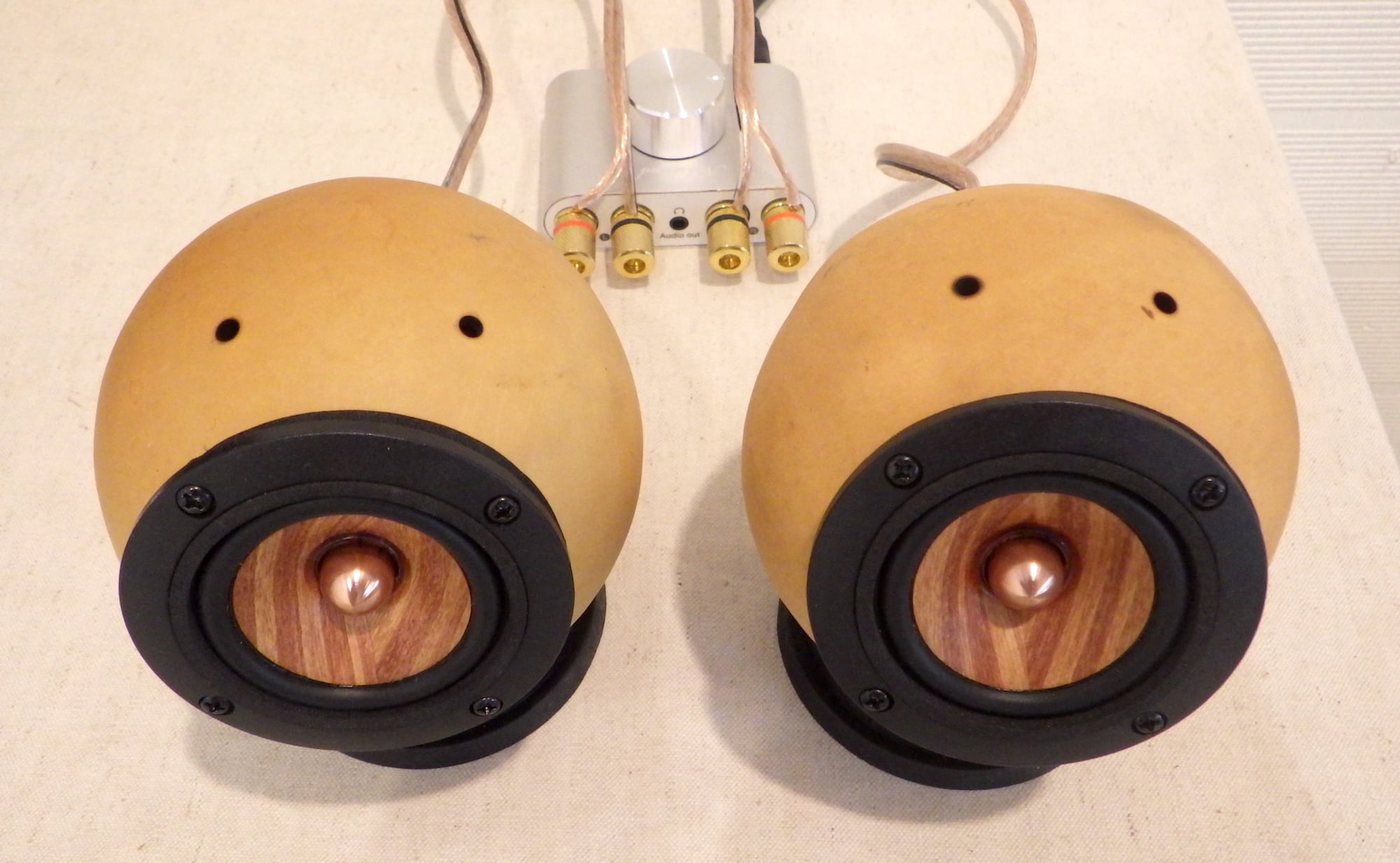 天然素材 瓢箪を材料にしたエンクロージャーに、木材(サペリマホガニー)でできたスピーカーユニット(PARC Audio DCU-F071W)を搭載。